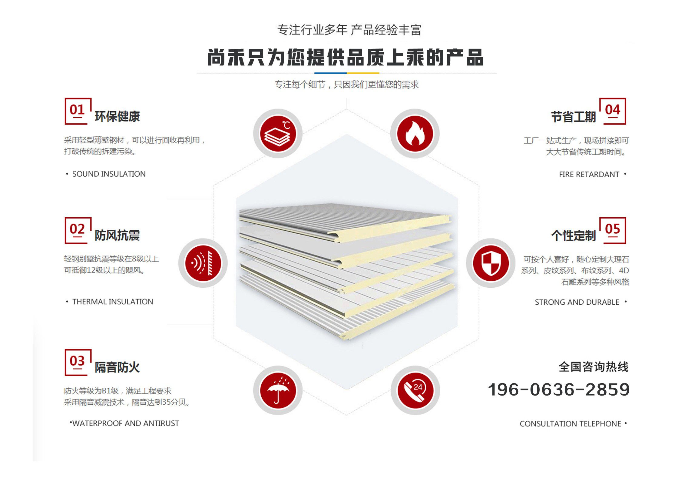 山東尚禾經(jīng)貿(mào)有限公司是集板材設(shè)計、研發(fā)、生產(chǎn)、施工、一體化的科技公司,并在同行業(yè)中率先通過了質(zhì)量、環(huán)境、安全管理體系認證。公司2011年投入資金2000余萬元引進世界先進的聚氨酯節(jié)能板連續(xù)生產(chǎn)線、意大利進口發(fā)泡系統(tǒng),采用六組份在線自動操作混合澆注技術(shù),在線一次性完成社會配料中心或工廠的配比混合工藝,并可以根據(jù)溫度在線自動調(diào)整,從而生產(chǎn)處與眾不同的高強度、節(jié)能型、綠色環(huán)保的聚氨酯夾芯板。(其使用年限高于同行業(yè)其他品牌5-10年) 公司主要經(jīng)營范圍包括聚氨酯夾芯板,PU夾芯板,冷庫板,潔凈板,聚氨酯冷庫板,冷庫保溫板的設(shè)計、生產(chǎn)、銷售、技術(shù)指導(dǎo)、安裝及一體、以及進出口業(yè)務(wù),是中部六省最大的綠色節(jié)能建材生產(chǎn)基地。聚氨酯夾芯板年產(chǎn)200萬平方米、PU夾芯板、冷庫保溫板500萬平方米、鏈整產(chǎn)業(yè)綜合實力,開創(chuàng)了六省至中西部創(chuàng)新型中小名企總部基地,并將著力推進中國中西部地區(qū)集成房屋住宅產(chǎn)業(yè)化發(fā)展進程。 科技創(chuàng)新、節(jié)能典范。千萬間始終秉承“誠信、合作”的企業(yè)文化精髓,長期致力于鋼板材結(jié)構(gòu)節(jié)能建筑產(chǎn)業(yè),愿與社會各界攜手合作,共鑄綠色、環(huán)保美好未來。 產(chǎn)品具有良好的絕熱、阻燃、隔音、環(huán)保、耐久性能,可廣泛應(yīng)用于工業(yè)、商用建筑內(nèi)外墻、以及民用建筑外墻保溫、空調(diào)通風系統(tǒng)、專用防火保溫門等領(lǐng)域。 我們始終秉承...